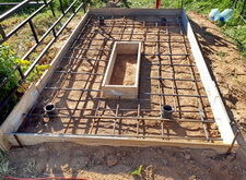 Далее выставляем опалубку, определяем место под цветник. Внутрь участка закладываем частую арматурную сетку. Там, где это возможно, привариваем её к сваям.