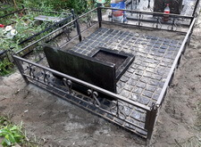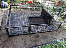 Когда брусчатка подсохла, мы принялись к финальным этапам работы: покрасили ограждение, а также восстановили потускневшую и практически нечитаемую надпись на надгробье. Так выглядела могила на момент окончания работы.
